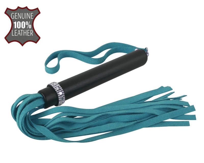 Выполнена плеть из натуральной кожи в бирюзовом цвете. Велюровые хвосты обеспечивают яркие, мощные, но совершенно безопасные удары. Удобная рукоять и специальная петля для запястья позволяют максимально контролировать силу и направление удара
